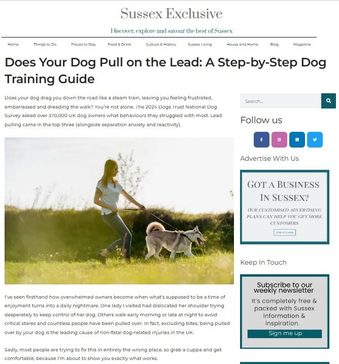 Sharon also writes a regular dog training column for Sussex Exclusive, where she shares practical insights on behaviour, calm leadership and building a stronger bond between owners and their dogs.